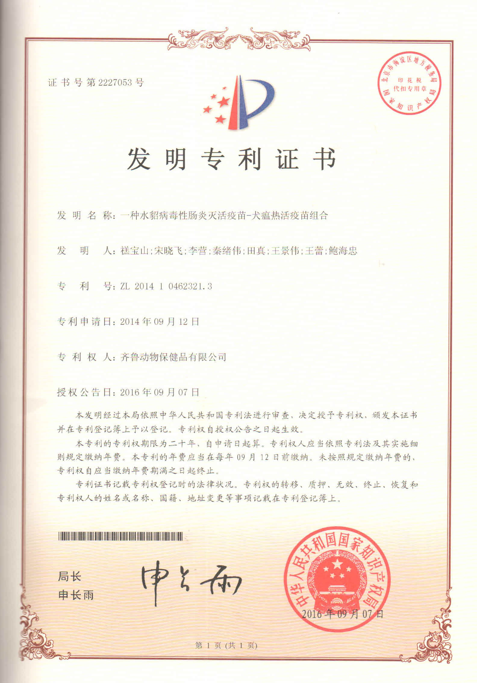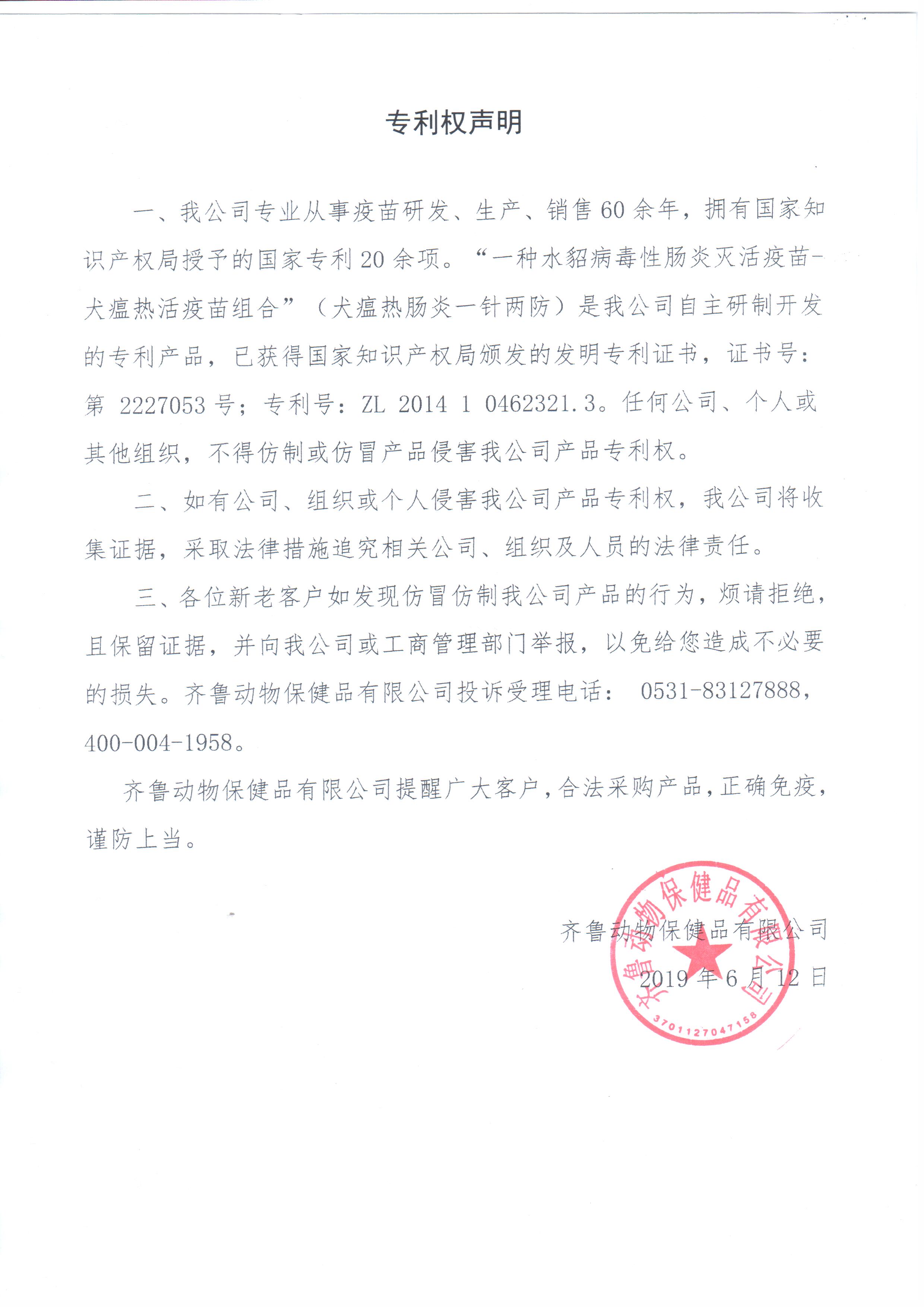 一、 我公司專業(yè)從事疫苗研發(fā)、生產、銷售60余年,擁有國家知識產權局授予的國家專利20余項。“一種水貂病毒性腸炎滅活疫苗-犬瘟熱活疫苗組合”(犬瘟熱腸炎一針兩防)是我公司自主研制開發(fā)的專利產品,已獲得國家知識產權局頒發(fā)的發(fā)明專利證書,證書號:第2227053號;專利號: ZL 2014 1 0462321.3。 任何公司、個人或其他組織,不得仿制或仿冒產品侵害我公司產品專利權。