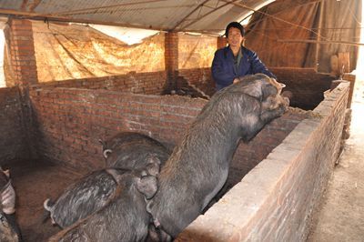 該村村民呂百景于2009年春用3000元從靳村鄉(xiāng)買(mǎi)回了3頭野豬崽,一公兩母。呂百景和妻子天天給這些野豬喂酒糟加雜糧的飼料,還到附近的山上割草讓野豬吃。在他們夫妻的精心喂養(yǎng)下,這些野豬生長(zhǎng)得很快,野性也小了許多。半多年后,這些野豬開(kāi)始繁殖。根據(jù)呂百景的觀察,野豬下的崽比家豬下的崽成活率高,于是,他就讓野豬和家豬雜交,繁衍了成活率高、抗病力強(qiáng)、長(zhǎng)得快、又少了許多野性的后代。