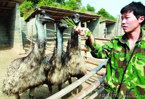 近日,廣西全州縣黃沙河鎮(zhèn)石城村青年農(nóng)民蔣宏偉在自己的養(yǎng)殖場里給鴕鳥喂食。今年24歲的蔣宏偉在廣東打工時掌握了鴕鳥的養(yǎng)殖技術(shù)。2011年他回到家鄉(xiāng)承包一片荒地,辦起一家鴕鳥養(yǎng)殖場,每年出欄鴕鳥60多只,實現(xiàn)了自己的致富夢想。