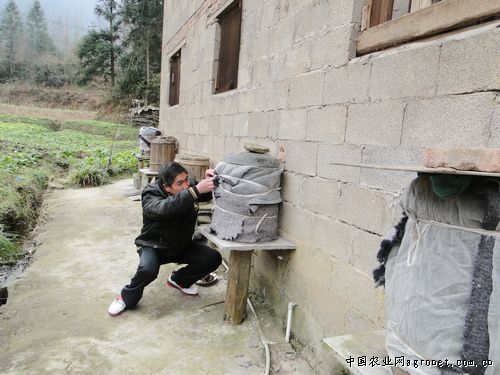 【導(dǎo)語·中國特種養(yǎng)殖網(wǎng)】石柱縣鴻菊蜂蜜專業(yè)合作社蜂農(nóng) 給蜜蜂桶裹上舊棉衣,以達(dá)到保溫效果。蜜蜂安全越冬是奪取來年蜂蜜高產(chǎn)的基礎(chǔ),如果防寒保暖措施不好,蜜蜂一旦受凍,就會(huì)引起大批死亡,造成巨大損失。