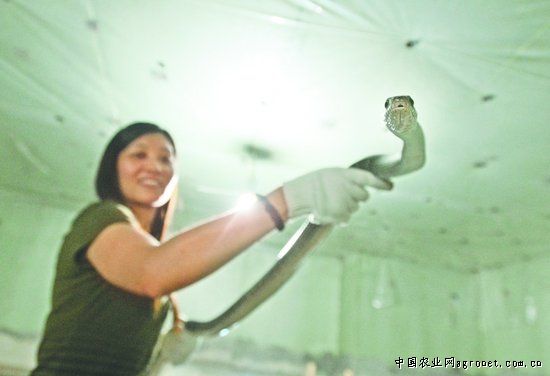 來到養(yǎng)蛇場,當(dāng)周平推開兩道緊閉的門后,一股帶腥味的熱浪撲面而來。眼鏡蛇的房間用大約1米高的墻隔成了很多個小隔間。借著電筒光,記者看到了發(fā)出“呼呼”聲的眼鏡蛇,它們“蹭”地直起身子,一副再靠近就要發(fā)動攻擊的樣子。楊靜這位“80后”女孩徒手抓起一條眼鏡蛇。眼鏡蛇在她手里滑動。她很淡定地說,和這些蛇都比較熟悉了,抓蛇要有技巧,盡量讓蛇不感到威脅。