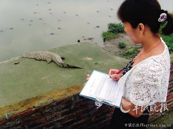 記者在鱷魚場見到,場內(nèi)有多個池塘分別飼養(yǎng)大小不同的鱷魚和四大家魚,一些鱷魚躺在石頭上,更多的鱷魚則躲在水里避暑納涼。“四大家魚用來作鱷魚的飼料”,鱷魚場管理人員胡俏嬋說,“每天中午12點鐘,是我和同事的固定監(jiān)測時間,我們會記錄當(dāng)天的氣溫和睛雨狀況,鱷魚是否躁動不安,反應(yīng)是否異常等,這項監(jiān)測記錄工作已堅持做了近10年。”