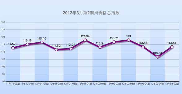據(jù)“中國·海寧皮革指數(shù)”信息系統(tǒng)監(jiān)測,2012年3月第2期周價格總指數(shù)報收于113.44點,上漲 6.83點,漲幅為6.41%,指數(shù)小幅上漲。