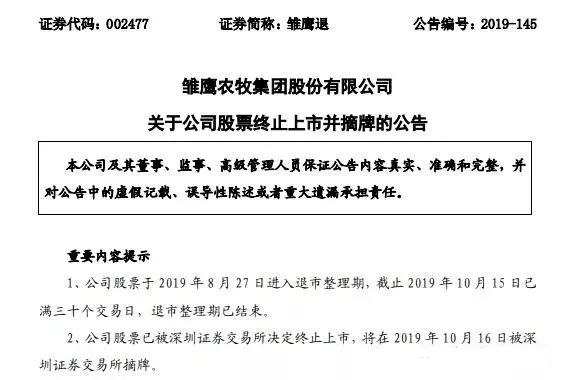 2019年10月15日是雛鷹農牧集團股份有限公司(002477,下稱“雛鷹農牧”)退市整理期最后一個交易日。10月15日晚間,雛鷹農牧發(fā)布公告稱,公司股票于8月27日進入退市整理期,截止10 月 15日已滿三十個交易日,退市整理期已結束。公司股票已被深交所決定終止上市,將在2019年10月16日被深交所摘牌。這意味著曾經的“養(yǎng)豬第一股”成為A股史上“破面值”退市第二股,曾經的養(yǎng)豬巨頭倒在了豬價起飛前。