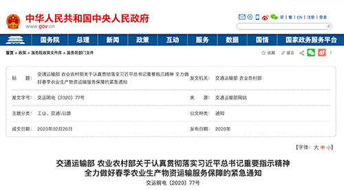 2月26日,交通運(yùn)輸部與農(nóng)業(yè)農(nóng)村部聯(lián)合發(fā)布《關(guān)于認(rèn)真貫徹落實(shí)習(xí)近平總書(shū)記重要指示精神全力做好春季農(nóng)業(yè)生產(chǎn)物資運(yùn)輸服務(wù)保障的緊急通知》。