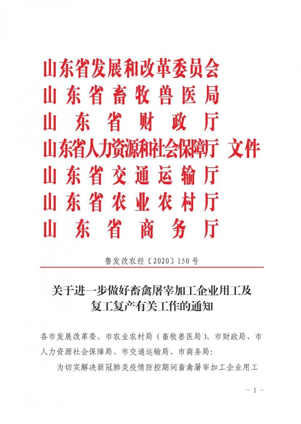 近日,根據(jù)省政府主要領導同志指示要求,為切實解決新冠肺炎疫情防控期間畜禽屠宰加工企業(yè)用工問題,推動復工復產工作,促進養(yǎng)殖業(yè)上下游產業(yè)鏈健康運行,省發(fā)展改革委、畜牧局、財政廳、人力資源社會保障廳、交通運輸廳、農業(yè)農村廳、商務廳等七部門聯(lián)合印發(fā)通知,就進一步做好畜禽屠宰加工企業(yè)用工及復工復產有關工作,出臺八條針對性政策措施。