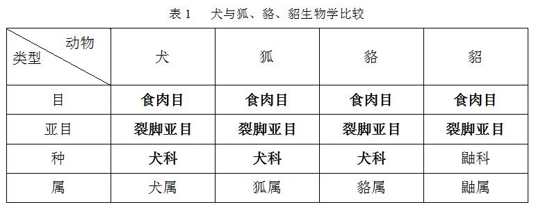 眾所周知,犬是屬于食肉目,裂腳亞目,犬科,犬屬。我們養(yǎng)殖的毛皮動物中主要種類是狐、貉、貂,而狐貍和貉與犬不同的只有屬,其他是一致的,通俗來說“祖父”是相似的;貂雖然種屬與犬、狐、貉不一樣,但又屬于一個家族,屬于“近親”(見表1 )。