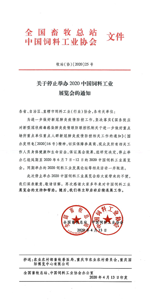 關(guān)于停止舉辦2020中國飼料工業(yè)展覽會(huì)的通知