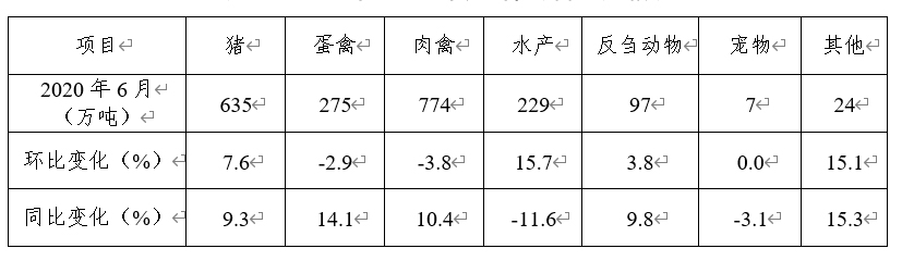 從品種看,6月份豬飼料產(chǎn)量635萬噸,環(huán)比增長7.6%,同比增長9.3%,自2018年10月份以來首次實(shí)現(xiàn)同比增長。蛋禽和肉禽飼料產(chǎn)量分別為275萬噸和774萬噸,環(huán)比分別下降2.9%和3.8%,同比繼續(xù)保持兩位數(shù)增長,分別達(dá)14.1%和10.4%。水產(chǎn)飼料產(chǎn)量229萬噸,環(huán)比增長15.7%,同比下降11.6%。反芻動(dòng)物飼料產(chǎn)量97萬噸,環(huán)比增長3.8%,同比增長9.8%。