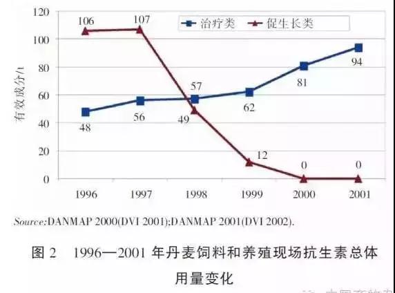 由圖2 可以看到,1996—2001年,丹麥現(xiàn)場(chǎng)處方用藥的年用量是不斷增加的,以有效成分計(jì)算,從48t增加到了94t(2001年);但飼料和養(yǎng)殖現(xiàn)場(chǎng)的抗生素總用量是降低的,從1996年的154t,下降到了2001年的94t。