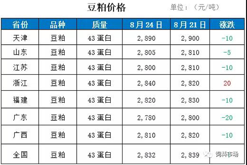 我們看到國(guó)內(nèi)豆粕期貨價(jià)格,經(jīng)歷了深度回落之后,近期再次整理好了形態(tài),后市的變量又會(huì)有哪些呢?現(xiàn)貨方面,8月24日沿海豆粕價(jià)格2780-2900元/噸一線,較上周五波動(dòng)10-20元/噸,其中天津2890-2900,山東2825-2880,江蘇2800-2860,東莞2780-2800,廣西地區(qū)2820-2840。受油廠脹庫(kù),下游提貨不暢影響,當(dāng)前豆粕現(xiàn)貨端價(jià)格依然表現(xiàn)疲軟。