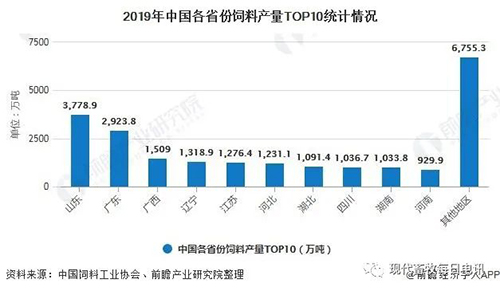 我國飼料行業(yè)的地區(qū)分布受畜禽和水產(chǎn)養(yǎng)殖產(chǎn)區(qū)、交通運輸條件等因素的影響,主要集中在東部沿海地區(qū)及河北、湖南等部分內(nèi)陸省份。2019年,我國飼料產(chǎn)量排名前十的省份分別是山東、廣東、廣西、遼寧、江蘇、河北、湖北、四川、湖南和河南,前十省份產(chǎn)量占全國總產(chǎn)量的比例達70.48%。