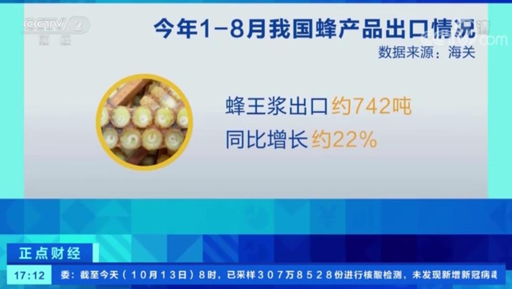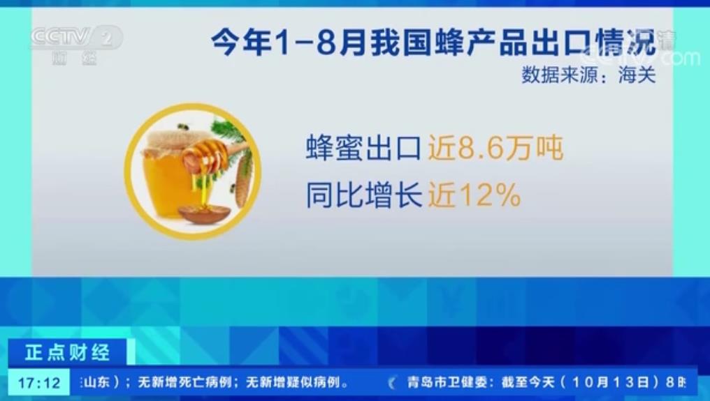記者黃雅潔:”據(jù)中國蜂產(chǎn)品協(xié)會統(tǒng)計,全國蜂產(chǎn)品相關(guān)企業(yè)達(dá)1300余家, 其中出口企業(yè)主要集中在浙江、安徽、湖北等地,主要出口地有日本、 歐盟、澳大利亞和中東地區(qū)。根據(jù)海關(guān)數(shù)據(jù),今年1—8月, 我國共出口蜂蜜近8.6萬噸,出口總量同比增長近12%。此外,我國也是全球最大蜂王漿出口國,產(chǎn)量占全球90%以上。今年1—8月,蜂王漿出口約742噸,同比增長22%。”