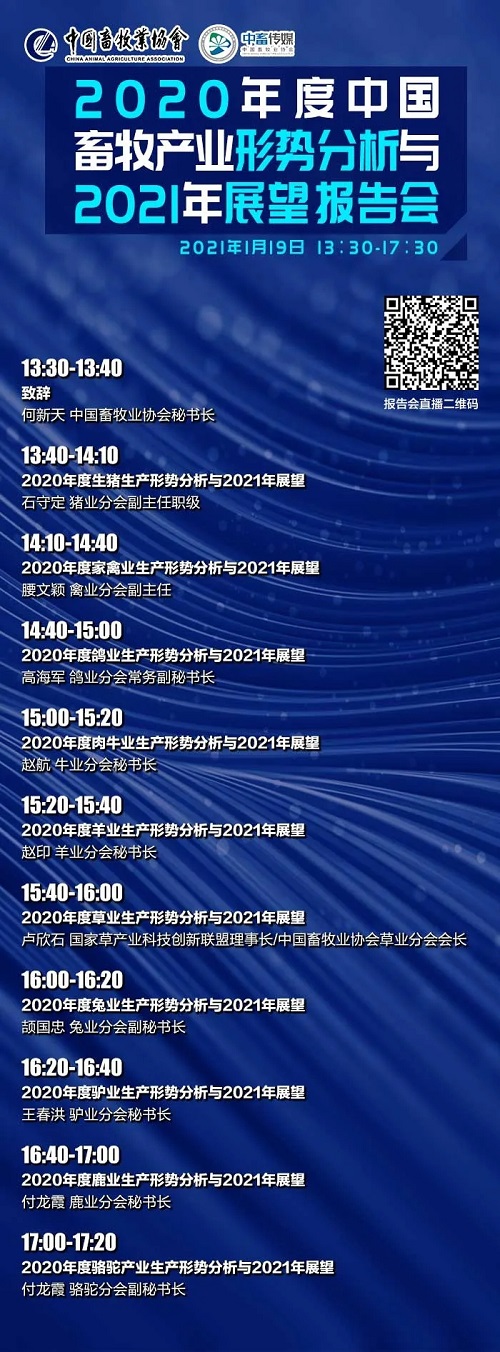 2020年已經(jīng)過去,為更有效的服務(wù)和引導(dǎo)畜牧業(yè)生產(chǎn),中國畜牧業(yè)協(xié)會(huì)將于1月19日下午13:30-17:30在中畜興牧直播間播出2020年度中國畜牧產(chǎn)業(yè)形勢分析與2021年展望報(bào)告會(huì)。