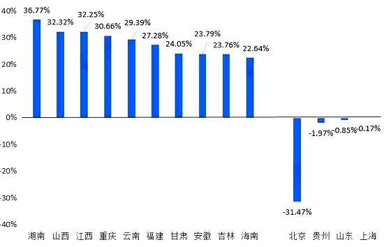 2019年全國(guó)畜牧業(yè)增幅TOP10省市分別為湖南省、山西省、江西省、重慶市等,湖南省增幅最大,達(dá)到36.77%;其次為山西省,增幅達(dá)32.32%。降幅最大的是北京市,下降了31.47%;其次是貴州省,下降了1.97%。