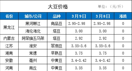 3月9日國(guó)產(chǎn)大豆價(jià)格大多維持穩(wěn)定,局部地區(qū)價(jià)格漲跌互現(xiàn),黑龍江地區(qū)商品豆裝車報(bào)價(jià)2.95-3.05元/斤,局部較上一日?qǐng)?bào)價(jià)波動(dòng)0.03-0.05元/斤;內(nèi)蒙古大豆裝車報(bào)2.9-2.92元/斤,較上一日?qǐng)?bào)價(jià)持平;江蘇地區(qū)翠扇豆裝車報(bào)3.8-3.88元/斤,較上一日?qǐng)?bào)價(jià)持平;河南地區(qū)中黃豆裝車報(bào)價(jià)3.35-3.45元/斤;河北地區(qū)中黃豆裝車報(bào)價(jià)3.3元/斤;湖南早熟豆裝車報(bào)3.75元/斤;湖北地區(qū)中黃豆報(bào)價(jià)3.55-3.6元/斤;安徽地區(qū)中黃豆裝車價(jià)3.38-3.43元/斤。