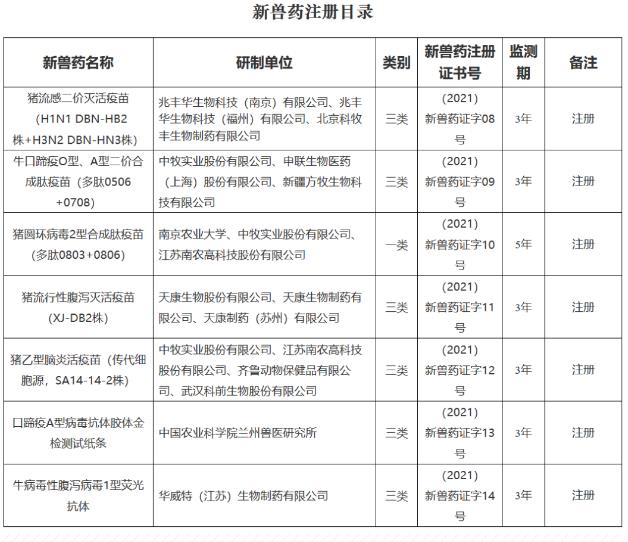 根據(jù)《獸藥管理條例》和《獸藥注冊辦法》規(guī)定,經(jīng)審查,批準兆豐華生物科技(南京)有限公司等15家單位申報的豬流感二價滅活疫苗(H1N1 DBN-HB2株+H3N2 DBN-HN3株)等7種獸藥產(chǎn)品為新獸藥,核發(fā)《新獸藥注冊證書》,發(fā)布產(chǎn)品制造及檢驗試行規(guī)程、質(zhì)量標準、說明書和內(nèi)包裝標簽,自發(fā)布之日起執(zhí)行。