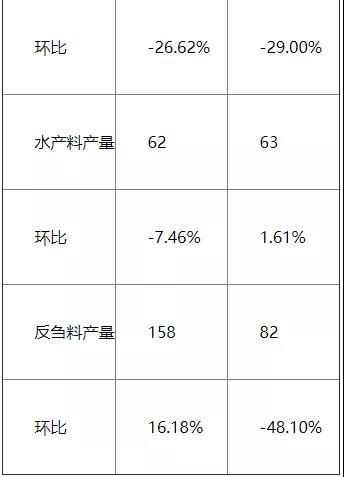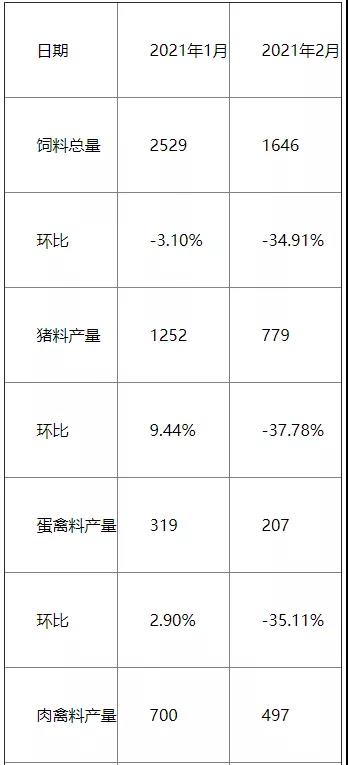 據(jù)中國(guó)飼料工業(yè)協(xié)會(huì)統(tǒng)計(jì),2021年1-2月,飼料總產(chǎn)量4175萬(wàn)噸,同比增長(zhǎng)20.9%。其中,豬飼料產(chǎn)量2032萬(wàn)噸同比增長(zhǎng)79.9%;蛋禽、肉禽飼料產(chǎn)量分別為526萬(wàn)噸、1197萬(wàn)噸,同比分別下降7.8%、15.2%;水產(chǎn)、反芻動(dòng)物飼料產(chǎn)量分別為125 萬(wàn)噸、240萬(wàn)噸,同比分別增長(zhǎng)8.9%、31.2%。從飼料產(chǎn)量的同比數(shù)據(jù)來(lái)看,本年度飼料總產(chǎn)量尤其是豬料產(chǎn)量較為可觀,也反映出生豬產(chǎn)能在不斷地恢復(fù),預(yù)計(jì)蛋白原料總需求向好發(fā)展。但是從環(huán)比數(shù)據(jù)來(lái)看(如下表2),2月份飼料總產(chǎn)量和豬料、蛋肉禽、反芻料產(chǎn)量大幅下降,僅有水產(chǎn)料在2月環(huán)比小幅增加。由此可以看出,除了因春節(jié)前集中出欄導(dǎo)致飼料需求階段性下滑,還有1月份起開始的非洲豬瘟影響仍在繼續(xù)甚至是加劇,環(huán)比由負(fù)轉(zhuǎn)正還需時(shí)日。