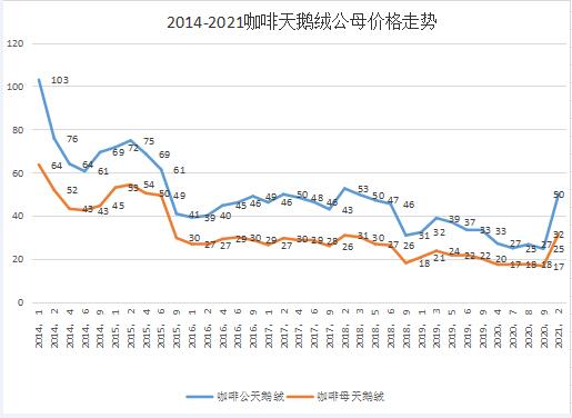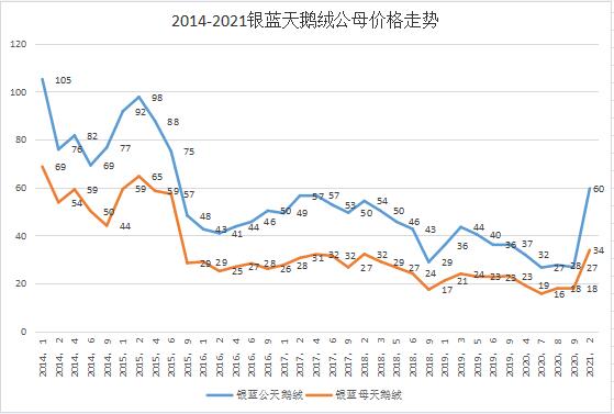2014-2021拍賣會(huì)價(jià)格走勢(shì)分析圖,從歷史的角度來看,目前的整體價(jià)格水平處在上面位置。對(duì)2014年-2021年的丹麥咖啡,白皮,銀藍(lán)的價(jià)格走勢(shì)進(jìn)行了細(xì)致分析,由圖可見,目前咖啡/銀藍(lán)公皮的價(jià)格距離2015年6月還有20%左右的差距,白公已經(jīng)基本回到2015年6月的水平,母皮整體價(jià)格還有30%的距離。