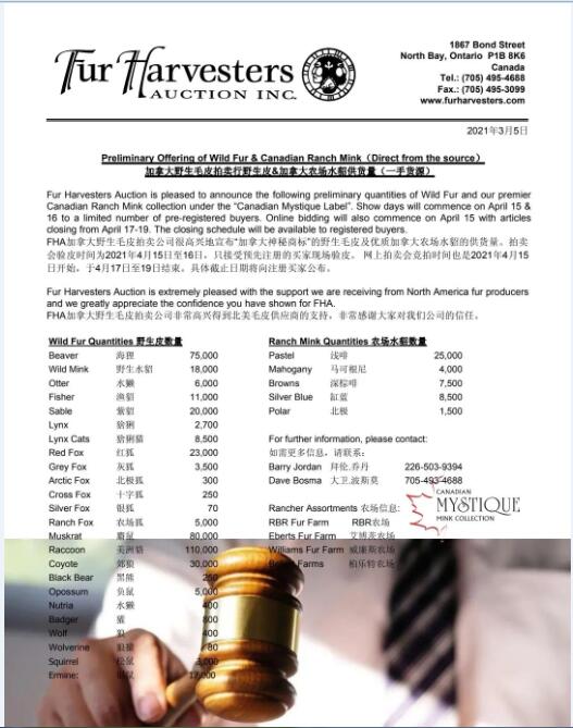 美國水貂交易所準(zhǔn)備4月提供,由于Covid-19流行病及其伴隨的旅行限制,4月份的拍賣會(huì)將以線上拍賣的方式進(jìn)行。拍賣會(huì)將于4月12日和13日舉行。關(guān)于每日的的拍賣時(shí)間,將近期通知。當(dāng)然,為了方便客戶拍皮,會(huì)認(rèn)真考慮亞洲和歐洲的時(shí)區(qū)。 很高興地宣布,將于2021年4月準(zhǔn)備出售60萬張北美水貂。所有的數(shù)量均為大約值,并有可能改變: 本黑 – 285,000張,來自以下農(nóng)場(chǎng): BLANKE-THANG-MILDBRAND-STEINHARDT(全母皮) – 25,000張 BRECKE MINK RANCH – 10,000張 THE BECKSTEADS – 50,000張 ENGEBRETSON-RIPPIN – 40,000張 J & G FUR FARM – 40,000張 ROWSER-WARNER-DAWSON – 40,000張 RUEF-LUCAS – 25,000張 SCHOLTEN FUR FARM – 32,000張 TRINITY FUR FARM – 23,000張 馬赫根尼 – 113,000張,來自以下農(nóng)場(chǎng): BALL BROTHERS – 25,000張 THE BECKSTEADS – 20,000張 MATHEWS-HARRIS – 38,000張 REES-KEYES – 30,000張 帕斯條 – 55,000張,來自以下農(nóng)場(chǎng): LYNN MATHEWS AND SONS – 10,000張 SHORELINE – 20,000張 ZIMBAL MINK – 25,000張 米黃 – 45,000張,來自以下農(nóng)場(chǎng): LYNN MATHEWS AND SON – 15,000張 REES FUR FARM - 30,000張 鐵灰 - 40,000張,來自以下農(nóng)場(chǎng): THANG-DELANY-BRECKE 銀藍(lán) - 15,000張,來自以下農(nóng)場(chǎng): LYNN MATHEWS AND SON 白貂 - 25,000張,來自以下農(nóng)場(chǎng): ZIMBAL MINK 藍(lán)寶石 - 10,000張,來自以下農(nóng)場(chǎng): HARRIS-SMIEJA 咖啡 - 10,000張,來自以下農(nóng)場(chǎng): LYNN MATHEWS AND SON 紫羅蘭 - 5,000張,來自以下農(nóng)場(chǎng): HARRIS-STAHL 今年剩余的水貂皮(包括種皮和等外皮)將在7月初的拍賣會(huì)出售。7月我們非常想做一個(gè)現(xiàn)場(chǎng)的、面對(duì)面的傳統(tǒng)拍賣會(huì)。7月份拍賣的最終日期現(xiàn)在還沒有確定,會(huì)根據(jù)實(shí)際情況做出決定。美國水貂交易所 April auction 2021 四月拍賣會(huì)初步銷售日程 Inspection: Begins on 14 April 驗(yàn)皮:4月14日開始 Digital auction: 20 - 26 April (Preliminary final sales date) 線上拍賣會(huì):4月20-26日(初步預(yù)計(jì)最終拍賣日) See our Preliminary Sales Programme here 參見下方初步銷售日程: Offering this April auction: 四月拍賣會(huì)供皮計(jì)劃: Palomino 米黃 150.000 White 白色 400.000 Silverblue Cross 銀藍(lán)十字 50.000 Brown 棕色 1.400.000 Mahogany 馬赫根尼 100.000 Silverblue 銀藍(lán) 700.000 Total mink 貂皮總量 2.800.000 Chinchilla 青紫蘭 Details to follow 后續(xù)公布 Foxes 狐貍 Details to follow 后續(xù)公布。