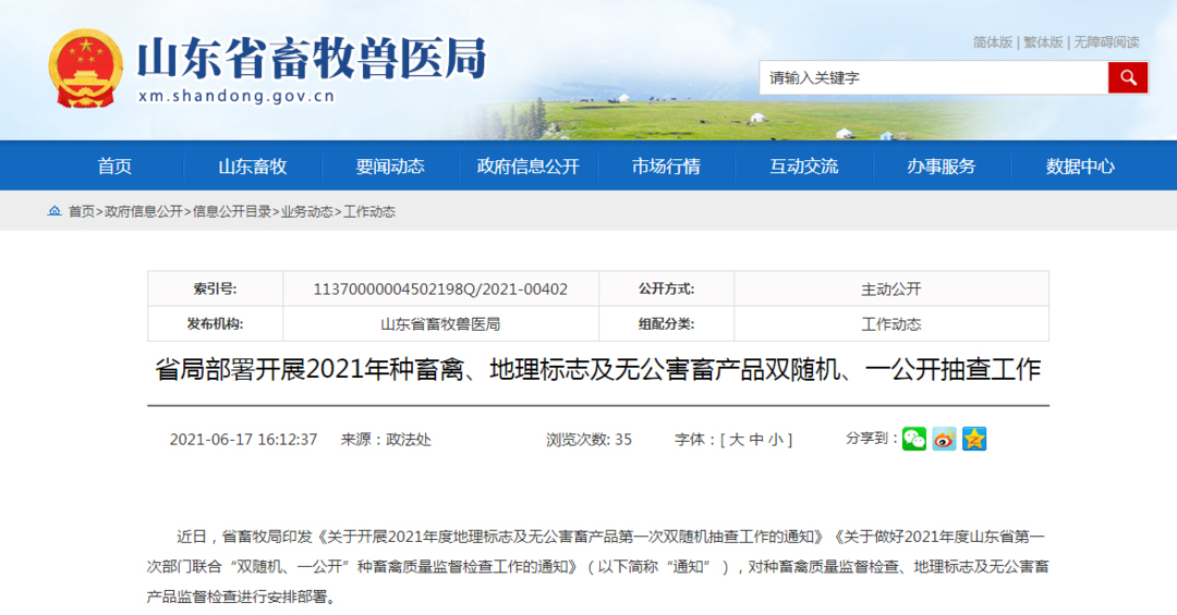 近日,省畜牧局印發(fā)《關(guān)于開展2021年度地理標(biāo)志及無公害畜產(chǎn)品第一次雙隨機(jī)抽查工作的通知》《關(guān)于做好2021年度山東省第一次部門聯(lián)合“雙隨機(jī)、一公開”種畜禽質(zhì)量監(jiān)督檢查工作的通知》(以下簡稱“通知”),對種畜禽質(zhì)量監(jiān)督檢查、地理標(biāo)志及無公害畜產(chǎn)品監(jiān)督檢查進(jìn)行安排部署。