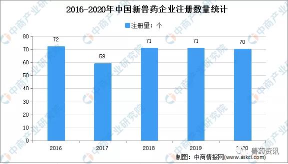 隨著國家出臺各項(xiàng)法律法規(guī)的實(shí)施,獸藥行業(yè)的生產(chǎn)經(jīng)營逐步規(guī)范,產(chǎn)品質(zhì)量大幅度提高。2020年中國新獸藥注冊數(shù)量為70個,比2019年減少1個。