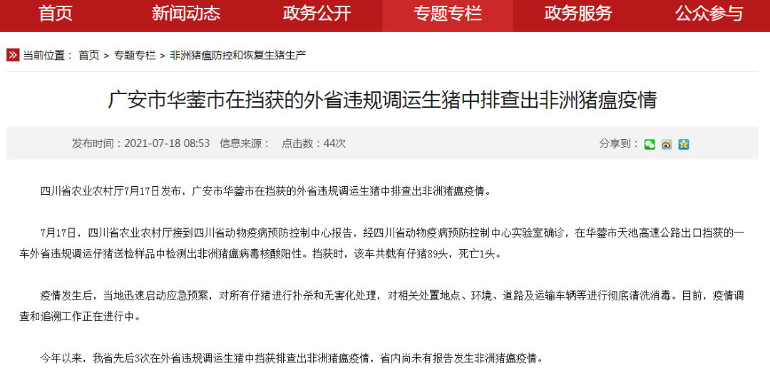 四川省農業(yè)農村廳7月17日發(fā)布,廣安市華鎣市在擋獲的外省違規(guī)調運生豬中排查出非洲豬瘟疫情。