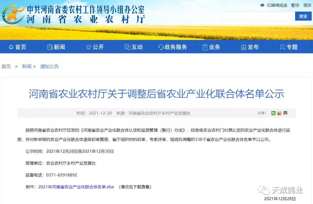 喜訊!天成鴿業(yè)獲評(píng)河南省農(nóng)業(yè)產(chǎn)業(yè)化聯(lián)合體