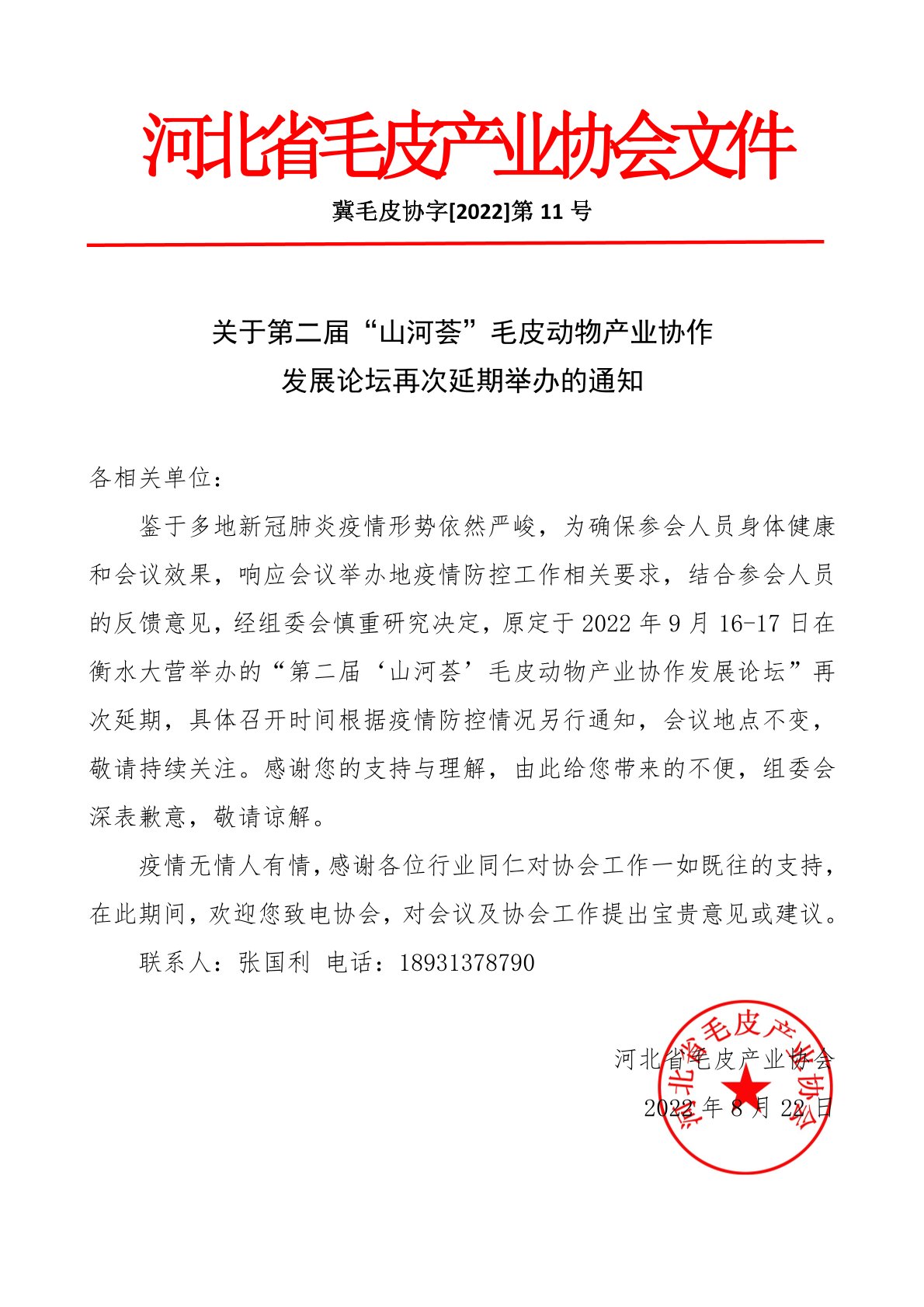 鑒于多地新冠肺炎疫情形勢依然嚴(yán)峻,為確保參會人員身體健康和會議效果,響應(yīng)會議舉辦地疫情防控工作相關(guān)要求,結(jié)合參會人員的反饋意見,經(jīng)組委會慎重研究決定,原定于2022年9月16-17日在衡水大營舉辦的“第二屆‘山河薈’毛皮動物產(chǎn)業(yè)協(xié)作發(fā)展論壇”再次延期,具體召開時(shí)間根據(jù)疫情防控情況另行通知,會議地點(diǎn)不變,敬請持續(xù)關(guān)注。感謝您的支持與理解,由此給您帶來的不便,組委會深表歉意,敬請諒解。