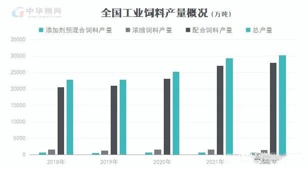 2022年全國工業(yè)飼料總產(chǎn)量首次突破3億噸,達(dá)30223.4萬噸,比上年增長3%。