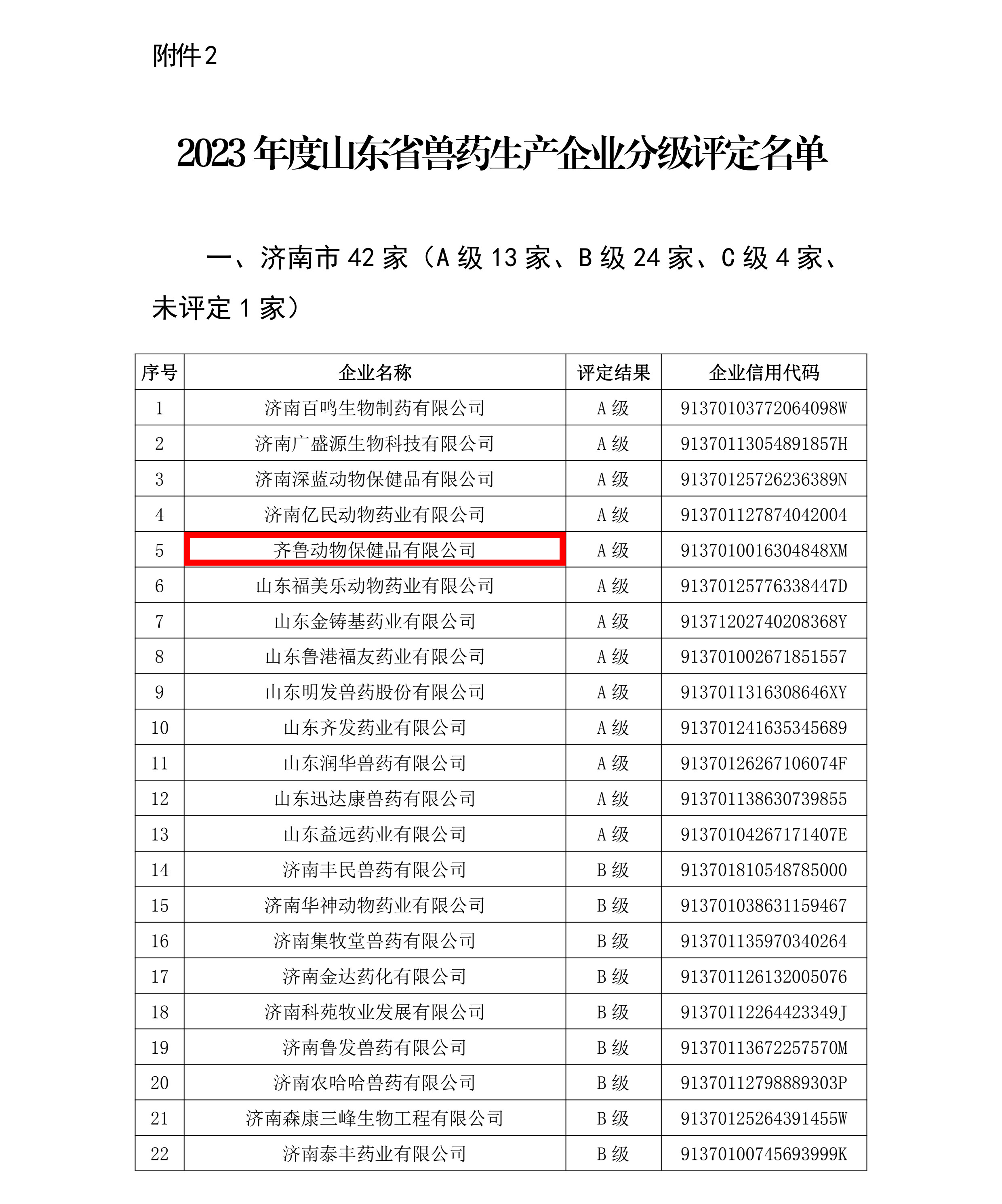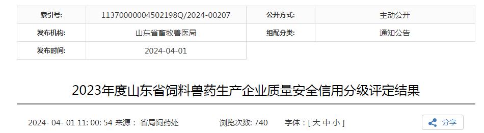 2023年度山東省飼料獸藥生產(chǎn)企業(yè)質(zhì)量安全信用分級(jí)評(píng)定結(jié)果