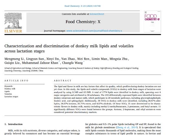 近日,聊城大學(xué)聊城毛驢高效繁育與生態(tài)飼養(yǎng)研究院王長法教授團隊在國際著名期刊《Food Chemistry X》(食品化學(xué)X)(IF2024=6.50,中科院SCI期刊分區(qū)1區(qū))在線發(fā)表題目為《Characterization and discrimination of donkey milk lipids and volatiles across lactation stages》(驢乳脂質(zhì)和揮發(fā)性物質(zhì)在泌乳階段的特征和鑒別)的研究論文。