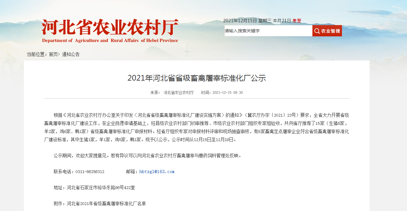 根據(jù)《河北省農(nóng)業(yè)農(nóng)村廳辦公室關(guān)于印發(fā)〈河北省省級畜禽屠宰標準化廠建設(shè)實施方案〉的通知》(冀農(nóng)廳辦字〔2021〕23號)要求,全省大力開展省級畜禽屠宰標準化廠建設(shè)工作,