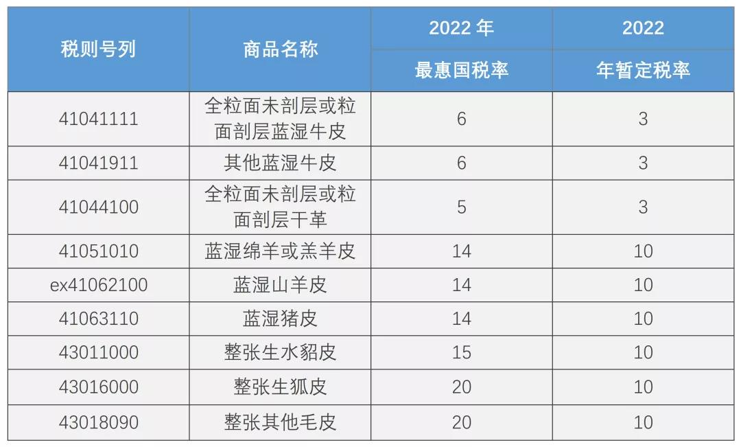 2021年12月13日,國務(wù)院關(guān)稅稅則委員會發(fā)布了《關(guān)于2022年關(guān)稅調(diào)整方案的通知》,該《通知》中關(guān)稅暫定稅率調(diào)整與皮革行業(yè)密切相關(guān)的包含41章到43章的9個稅號(見表中所列)