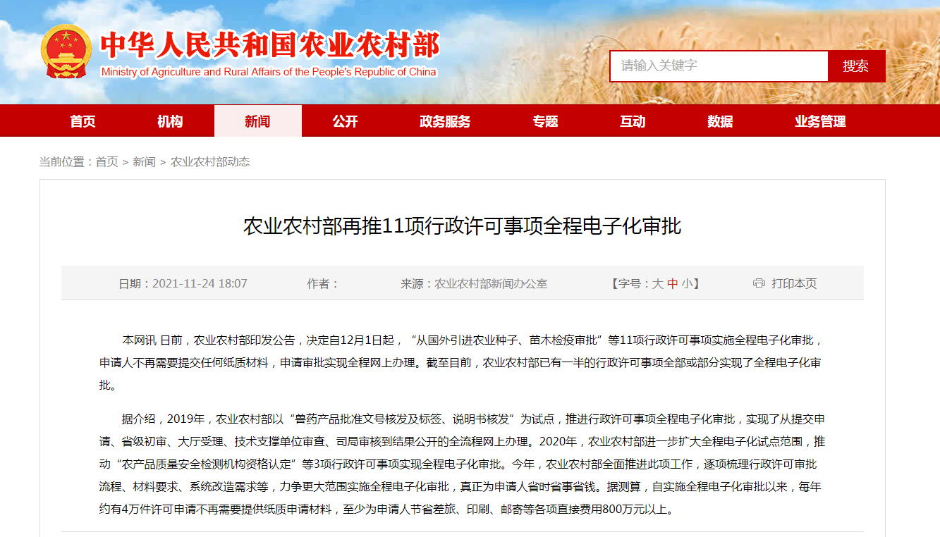 日前,農業(yè)農村部印發(fā)公告,決定自12月1日起,“從國外引進農業(yè)種子、苗木檢疫審批”等11項行政許可事項實施全程電子化審批,申請人不再需要提交任何紙質材料,申請審