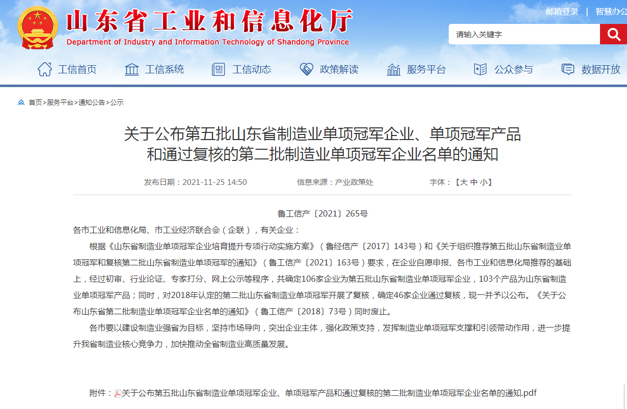 魯工信產〔2021〕265號 各市工業(yè)和信息化局、市工業(yè)經(jīng)濟聯(lián)合會(企聯(lián)),有關企業(yè): 根據(jù)《山東省制造業(yè)單項冠軍企業(yè)培育提升專項行動實施方案》(魯經(jīng)信產〔2017〕143