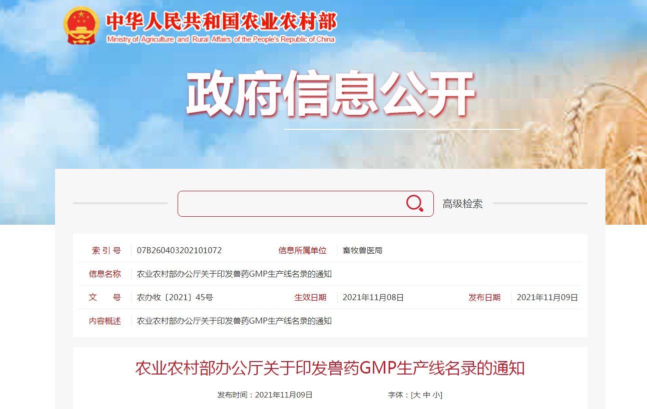 農業(yè)農村部辦公廳關于印發(fā)獸藥GMP生產線名錄的通知 各省、自治區(qū)、直轄市農業(yè)(農牧)、畜牧獸醫(yī)廳(局、委),新疆生產建設兵團農業(yè)農村局: 為貫徹落實《獸藥生產質量管理