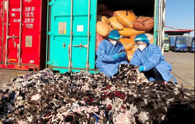關員現(xiàn)場清點查獲的動物毛皮邊角料 近日,黃島海關查獲1批禁止進口動物毛皮邊角料,共計5.67噸?! ‘斎?,海關關員在查驗一批申報品名為“貂毛皮裁片、兔毛皮裁片