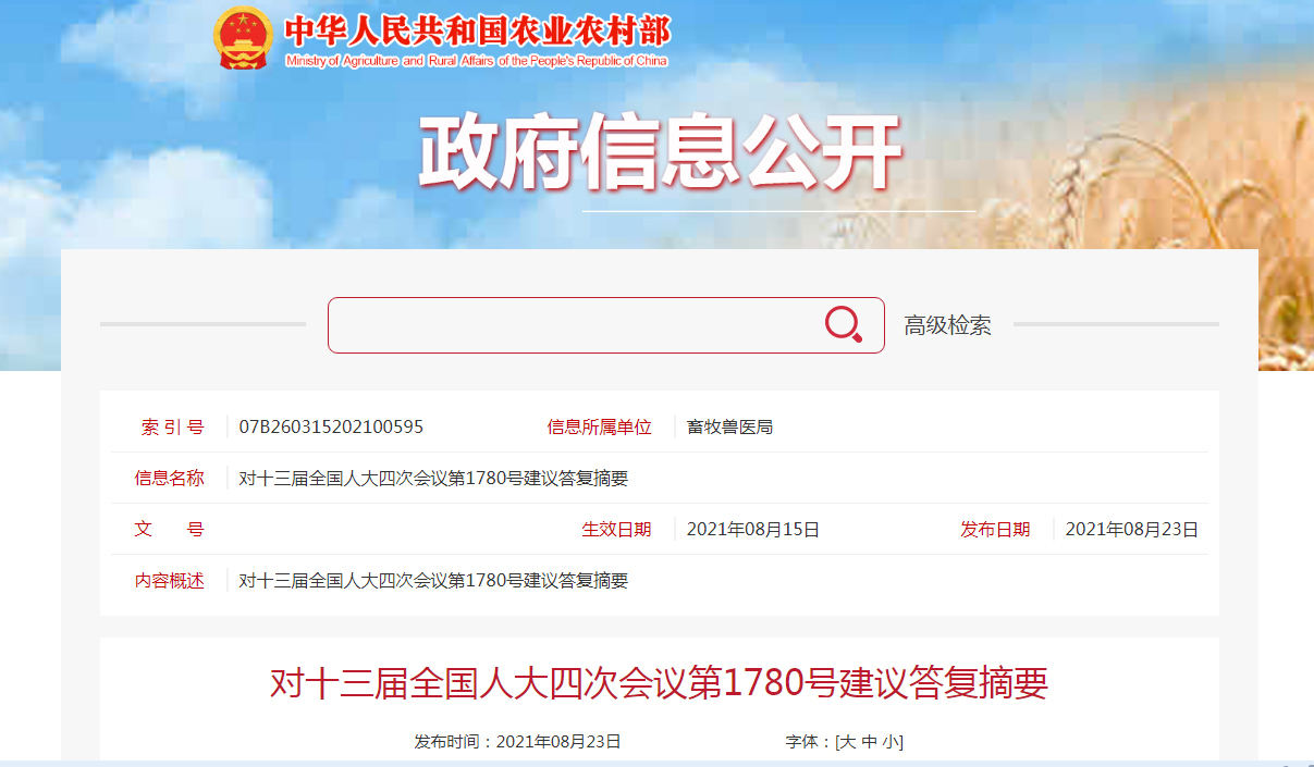 對(duì)十三屆全國(guó)人大四次會(huì)議第1780號(hào)建議答復(fù)摘要 農(nóng)業(yè)農(nóng)村部高度重視獸用疫苗生產(chǎn)企業(yè)生物安全管理,制定出臺(tái)了《口蹄疫、高致病性禽流感疫苗生產(chǎn)企業(yè)設(shè)置規(guī)劃》和《獸用