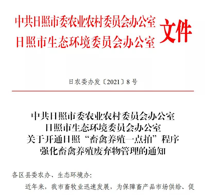 近日,山東省日照市委農(nóng)辦、市環(huán)委會辦公室聯(lián)合下發(fā)《關(guān)于開通日照“畜禽養(yǎng)殖一點拍”程序強化畜禽養(yǎng)殖廢棄物管理的通知》(日農(nóng)委辦發(fā)〔2021〕8號),“日照