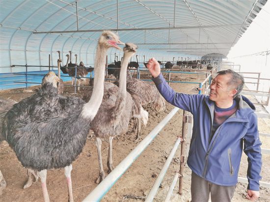 趙金柱(左一)在展示用鴕鳥(niǎo)蛋雕刻的工藝品。 趙金柱和他養(yǎng)殖的鴕鳥(niǎo)?! 〗?,春雨滋潤(rùn)著寒地黑土,走進(jìn)鴕鳥(niǎo)養(yǎng)殖基地,存欄830只鴕鳥(niǎo)正在歡快地奔跑著。展廳里,琳瑯滿目的鴕鳥(niǎo)深