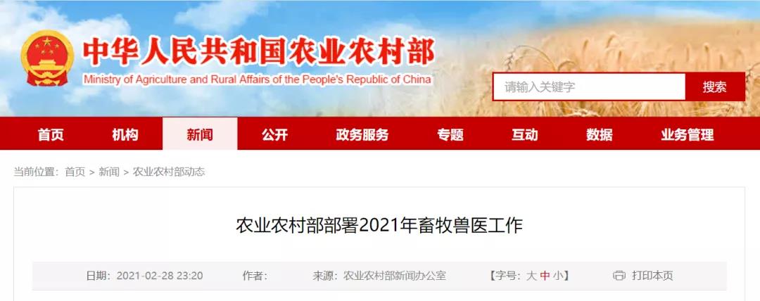 2月25日,農(nóng)業(yè)農(nóng)村部召開畜牧獸醫(yī)工作部署會(huì)。會(huì)議強(qiáng)調(diào),要按照“保供固安全、振興暢循環(huán)”的“三農(nóng)”工作定位,明確工作任務(wù),落實(shí)責(zé)任分工,統(tǒng)一認(rèn)識(shí)、統(tǒng)