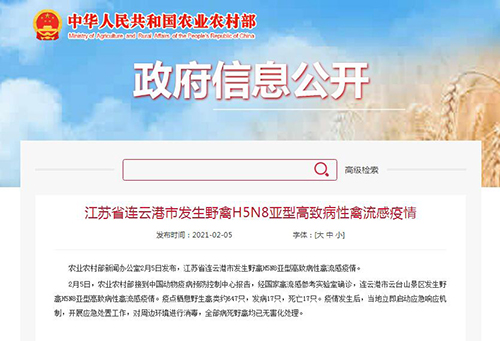 2月5日,農(nóng)業(yè)農(nóng)村部接到中國(guó)動(dòng)物疫病預(yù)防控制中心報(bào)告,經(jīng)國(guó)家禽流感參考實(shí)驗(yàn)室確診,連云港市云臺(tái)山景區(qū)發(fā)生野禽H5N8亞型高致病性禽流感疫情。疫點(diǎn)棲息野生禽類(lèi)約6