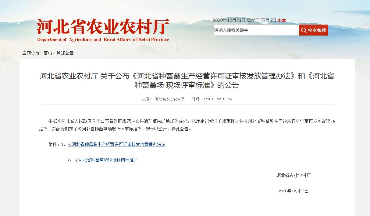 12月17日,省政府辦公廳印發(fā)《河北省種畜禽生產(chǎn)經(jīng)營許可證審核發(fā)放管理辦法》,凡在我省行政區(qū)域內(nèi)從事種畜禽生產(chǎn)經(jīng)營或生產(chǎn)商品代仔畜、雛禽的單位或個人,應(yīng)依照本辦