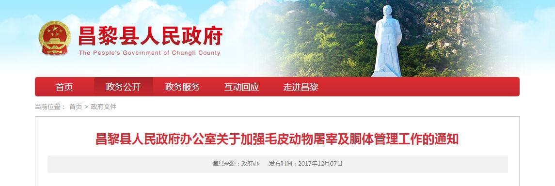 昌黎縣人民政府關(guān)于加強毛皮動物胴體管理工作的通 告 為進一步加強毛皮動物胴體管理工作,確保我縣皮毛產(chǎn)業(yè)健康、穩(wěn)定發(fā)展,依據(jù)《中華人民共和國刑法》《中華人民共和國
