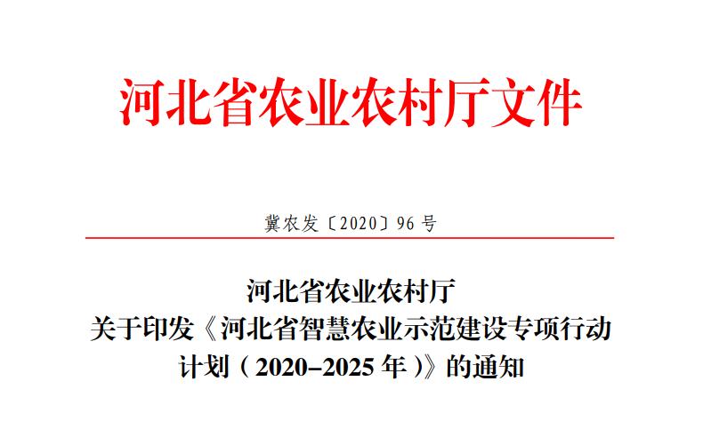 省農業(yè)農村廳日前印發(fā)《河北省智慧農業(yè)示范建設專項行動計劃(2020—2025年)》。行動計劃提出,緊緊圍繞實施鄉(xiāng)村振興戰(zhàn)略,加快推進物聯網、人工智能、大數據、區(qū)塊