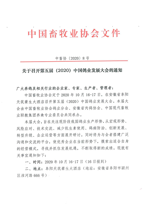 ?為了更好地應對我國鴿業(yè)當前面臨的困難和挑戰(zhàn),加快實現(xiàn)我國鴿產(chǎn)業(yè)轉型升級,推動我國鴿業(yè)更快更好發(fā)展,中國畜牧業(yè)協(xié)會擬于2020年10月16-17號(16號報到),在安徽阜陽召開第五屆