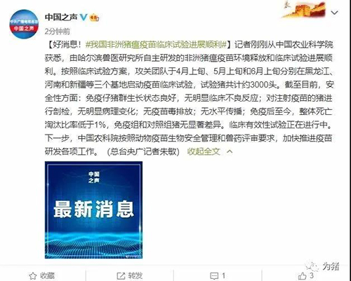 中國農(nóng)業(yè)科學(xué)院2017-2020年重大科研進(jìn)展發(fā)布會上獲悉,由哈爾濱獸醫(yī)研究所自主研發(fā)的非洲豬瘟疫苗環(huán)境釋放和臨床試驗進(jìn)展順利。 我國發(fā)生非洲豬瘟疫情后,按照農(nóng)業(yè)農(nóng)村部黨組統(tǒng)
