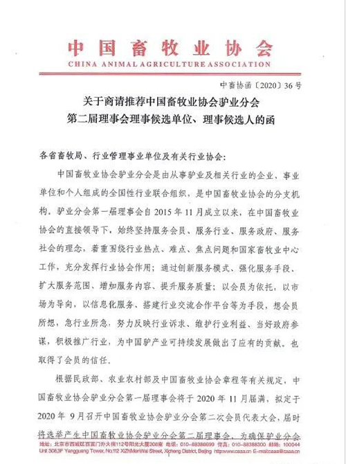 關(guān)于商請推薦中國畜牧業(yè)協(xié)會驢業(yè)分會第二屆理事會理事候選單位、理事候選人的函