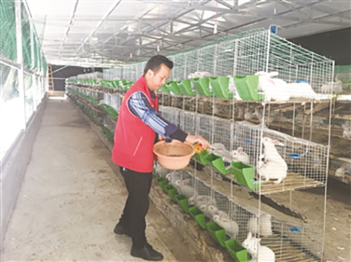 工作人員正在喂養(yǎng)兔子 5月28日,記者沿著崎嶇的山路來(lái)到了距離安順90多公里的紫云自治縣猴場(chǎng)鎮(zhèn)打啷村,山間綠樹(shù)成蔭,幾間養(yǎng)殖廠房整齊的排列著,廠房里的一排排兔子,有的活蹦亂